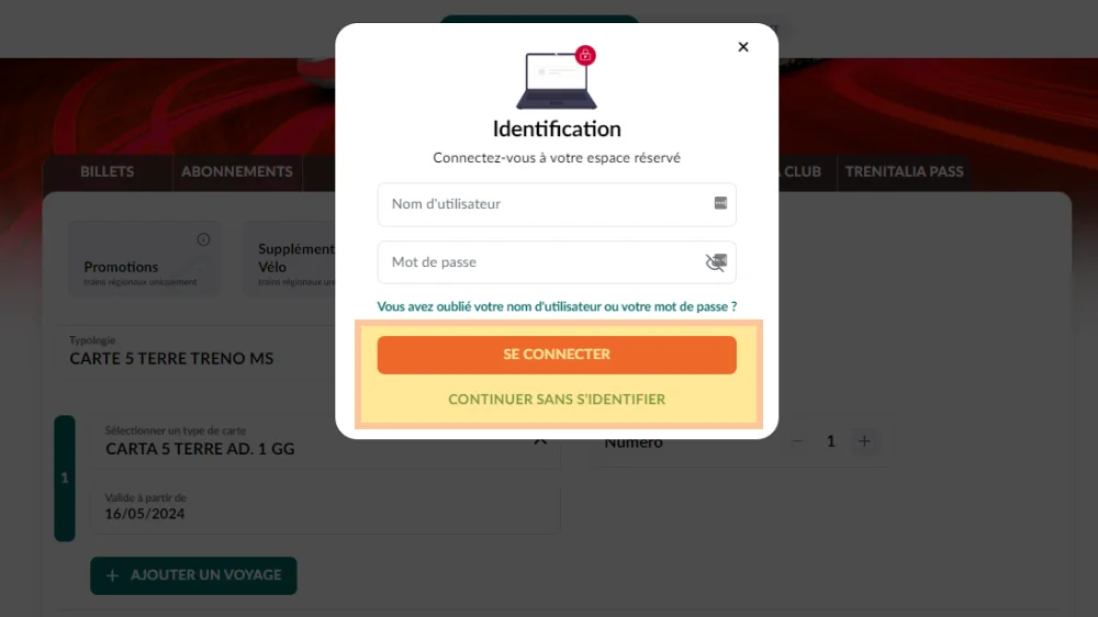 Tu peux passer à la caisse en tant qu’invité ou utiliser tes données de connexion Trenitalia.
