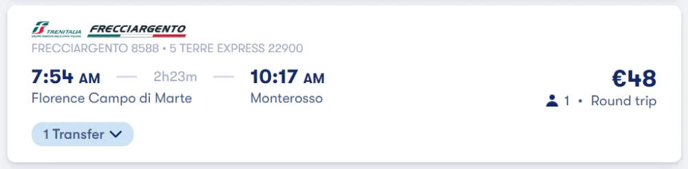 La maggior parte dei treni diretti alle Cinque Terre da Firenze parte da Firenze Santa Maria Novella, ma ci sono anche alcuni treni ad alta velocità che partono da Firenze Campo Di Marte. Non escludere quindi che questa sia una stazione di partenza.