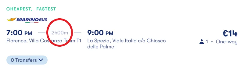 Il vantaggio dell'autobus è che può essere conveniente: alcuni biglietti costano meno di 20 euro. Inoltre, il punto di consegna del Marinobus è vicino al porto di La Spezia, quindi è un'ottima scelta se vuoi prendere una barca per le Cinque Terre.